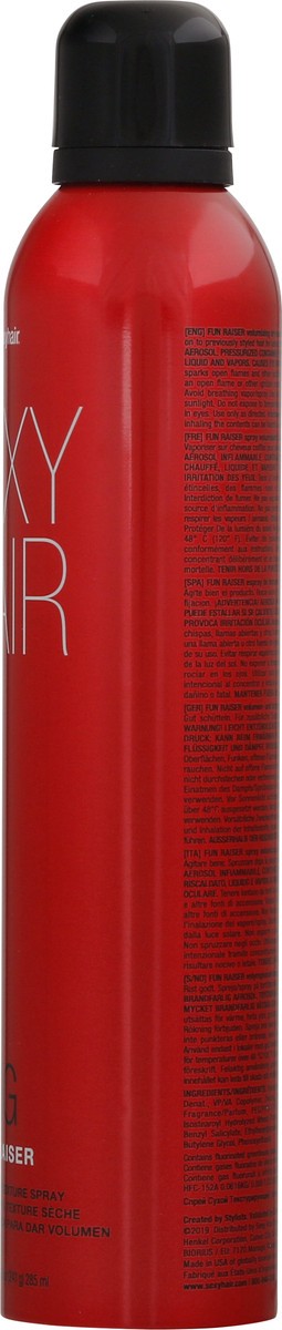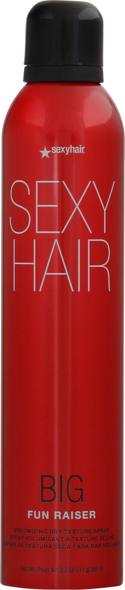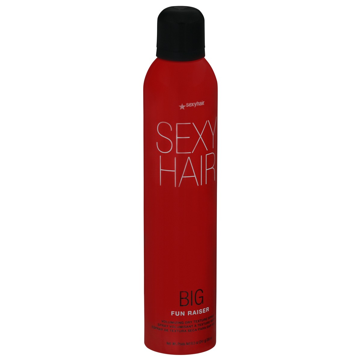 Volumizing dry texture spray. Big Fun Raiser volumizing dry texture spray. Created by stylists. Validated by salons. 7 texture level. For use on dry hair. www.sexyhair.com. Made in USA of globally sou…