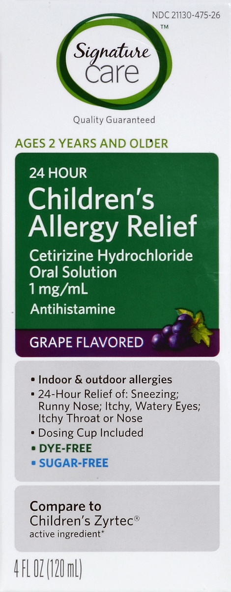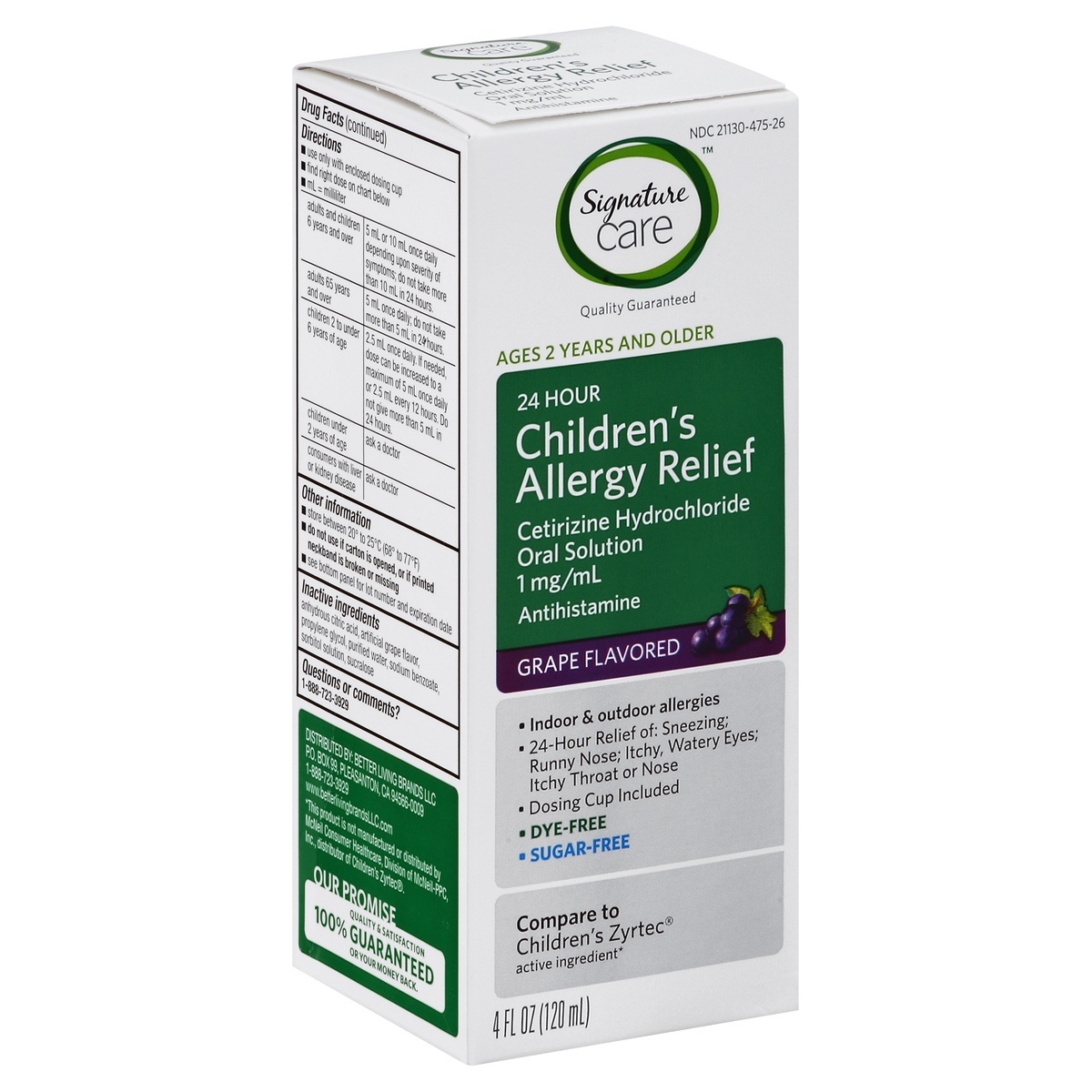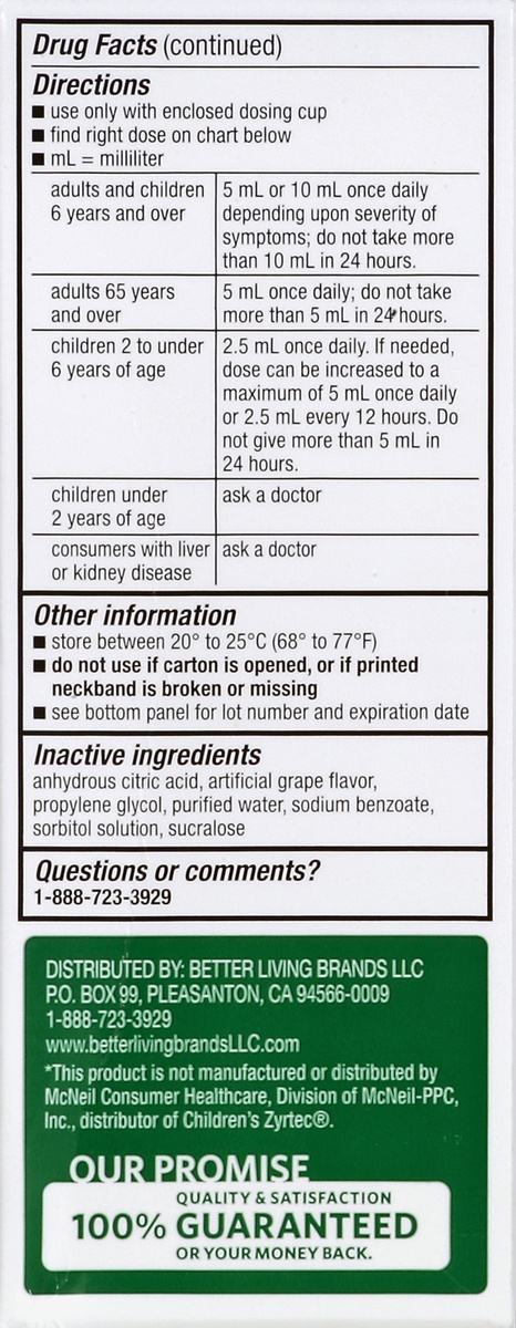 Active Ingredients: In Each 5 ml: Cetirizine HCl (5 mg). Purpose: Antihistamine. Inactive Ingredients: Anhydrous Citric Acid, Artificial Grape Flavor, Propylene Glycol, Purified Water, Sodium Benzoa…