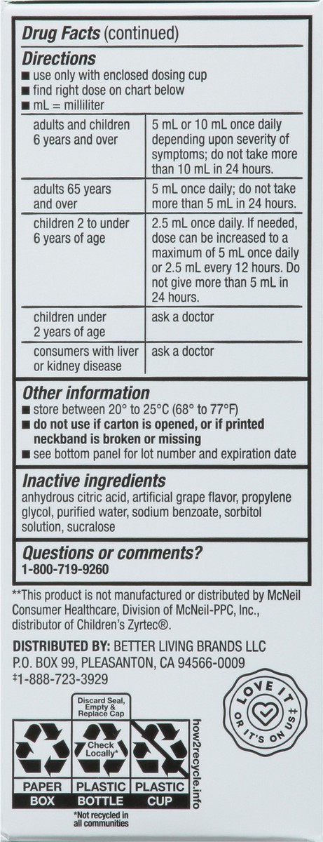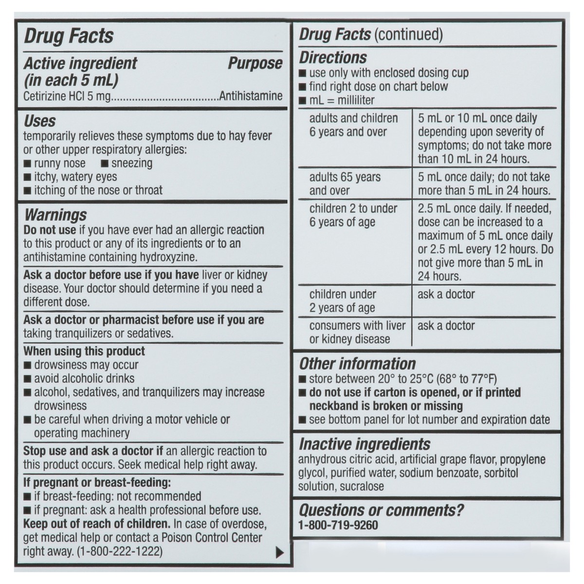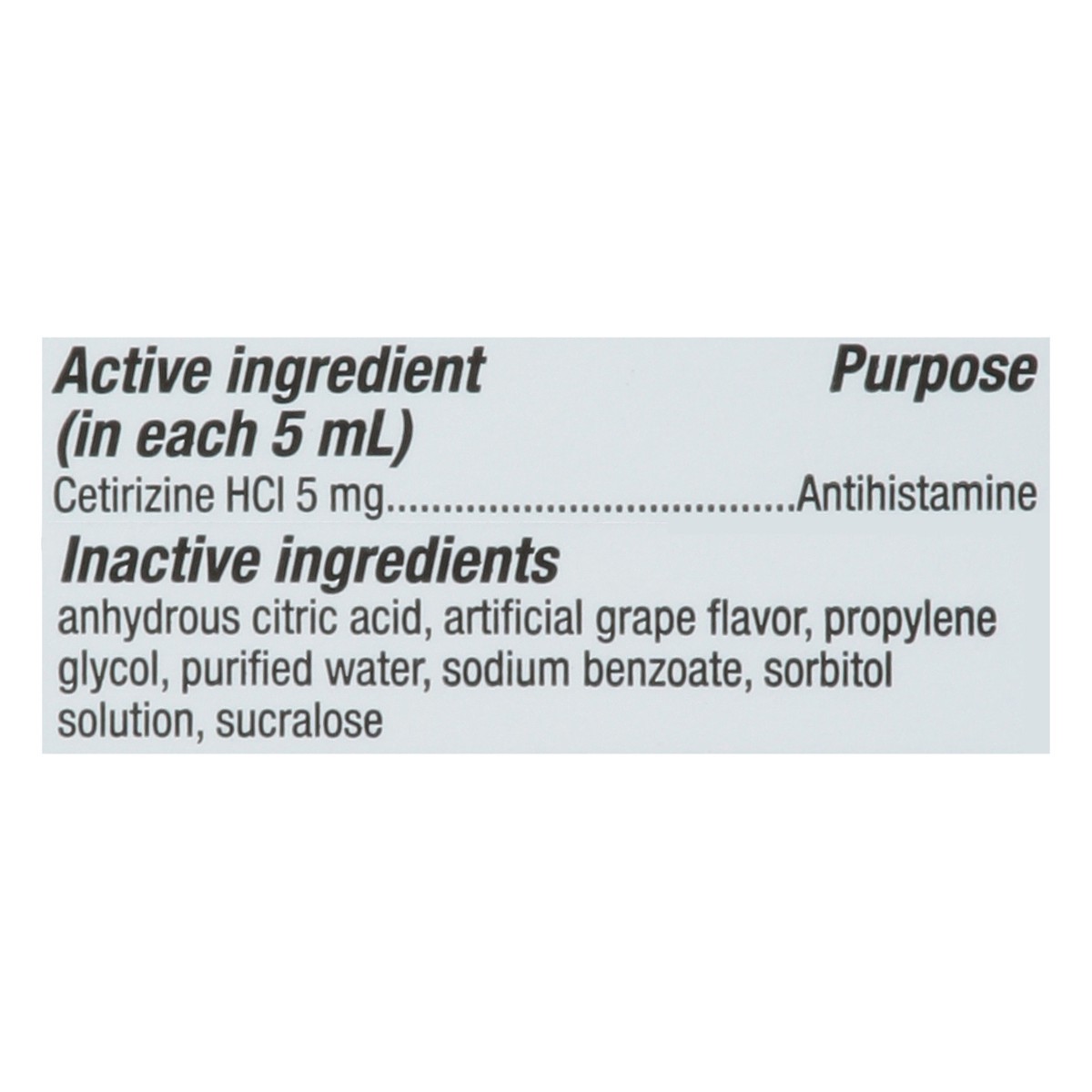 In Each 5 mL: Active Ingredients: Cetirizine HCI (5 mg), Antihistamine. Inactive Ingredients: Anhydrous Citric Acid, Artificial Grape Flavor, Propylene Glycol, Purified Water, Sodium Benzoate, Sorbito…