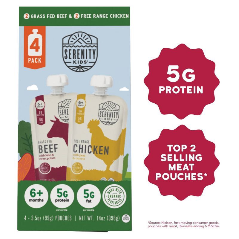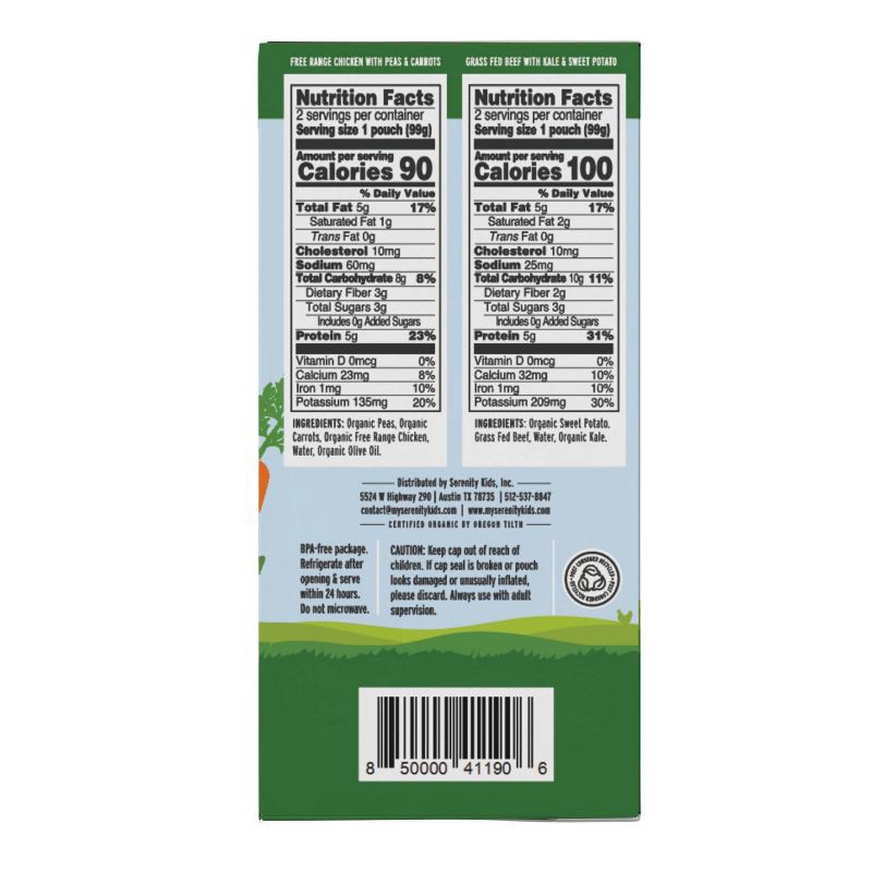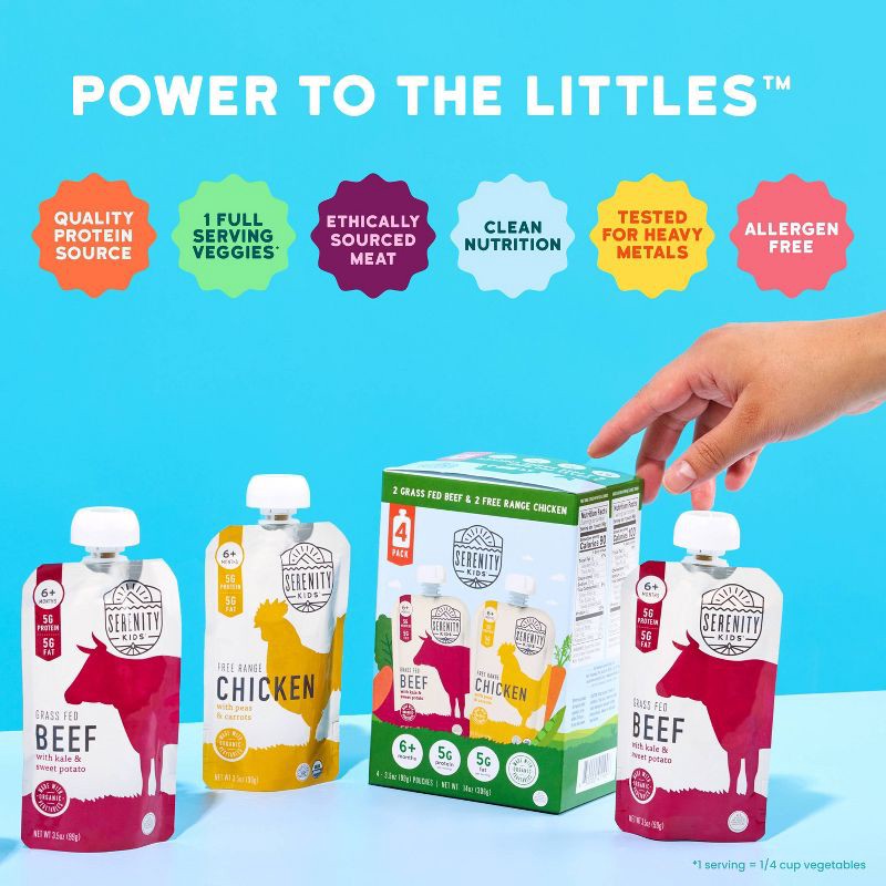 Serenity Kids Variety Pack includes 4 total baby food pouches: (2) Free Range Chicken with Organic Peas & Carrots and (2) Grass Fed Beef with Organic Sweet Potato & Kale. This variety pack is perfect …