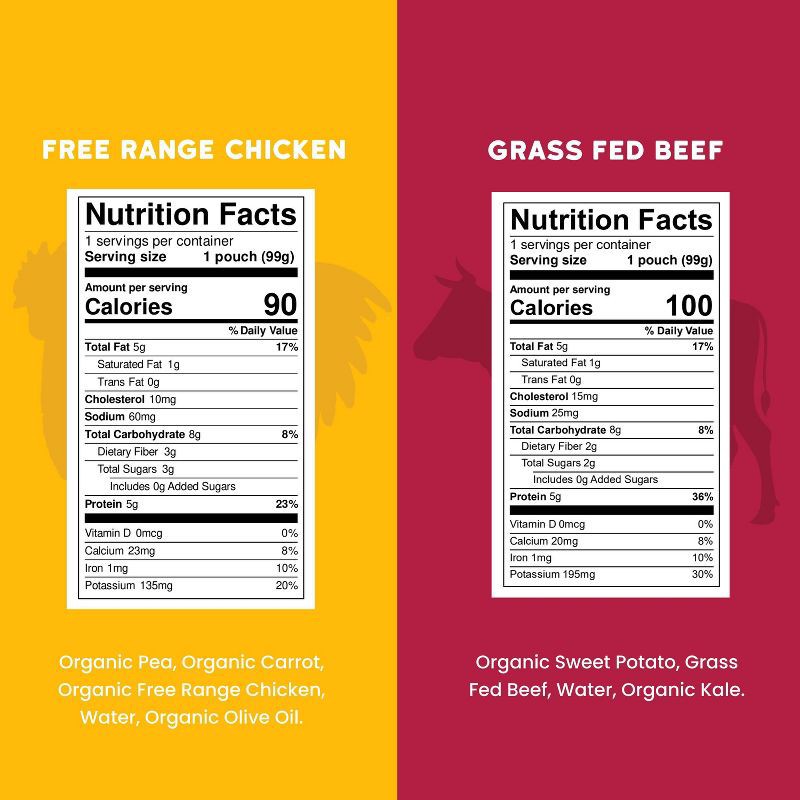 - Variety pack includes 4 total baby food pouches: (2) free range chicken and (2) grass feed beef