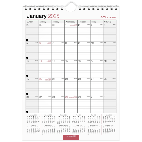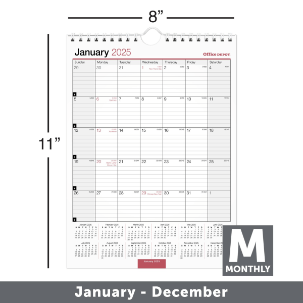 Organize your busy life with the 2025 Office Depot Monthly Wall Calendar. The monthly spreads include ruled daily blocks and reference calendars to help you stay ahead. 12 months: January 2025 to Deceā¦