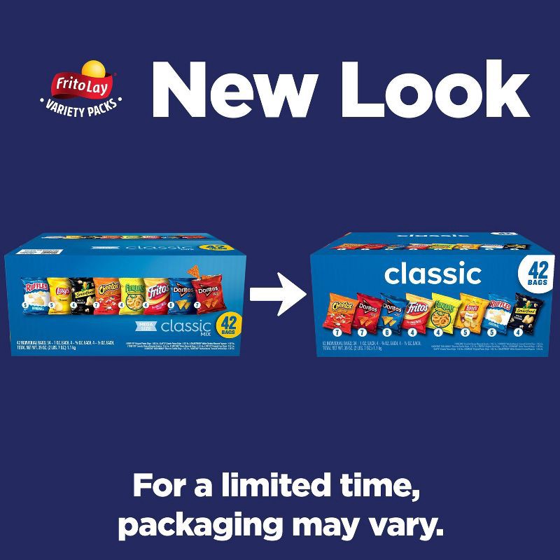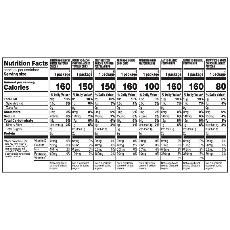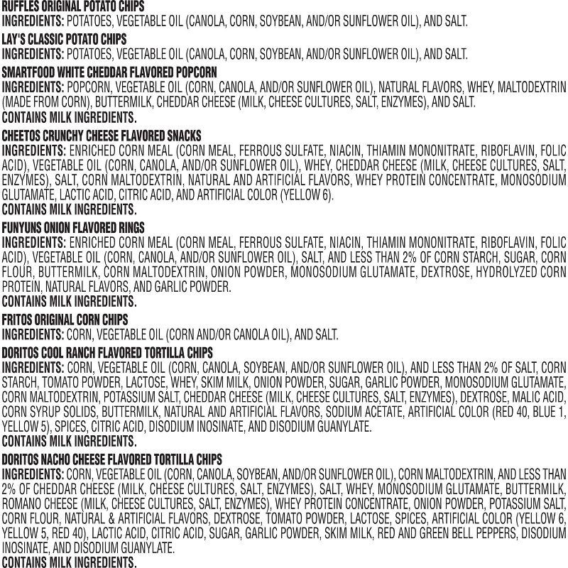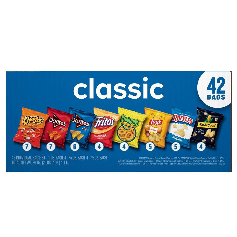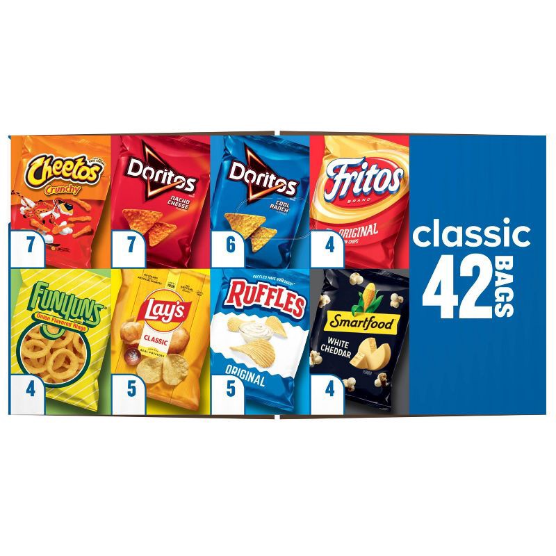 - Frito Lay Classic Mix Variety Pack includes 42 individual bags (1 oz) of (5) Ruffles Original, (5) lay's Classic, (4) Smartfood White Cheddar, (7) Cheetos Crunchy, (4) Funyuns Onion Flavored Rings, (4) Fritos Original, (6) Doritos Cool Ranch and (7) Doritos Nacho Cheese.