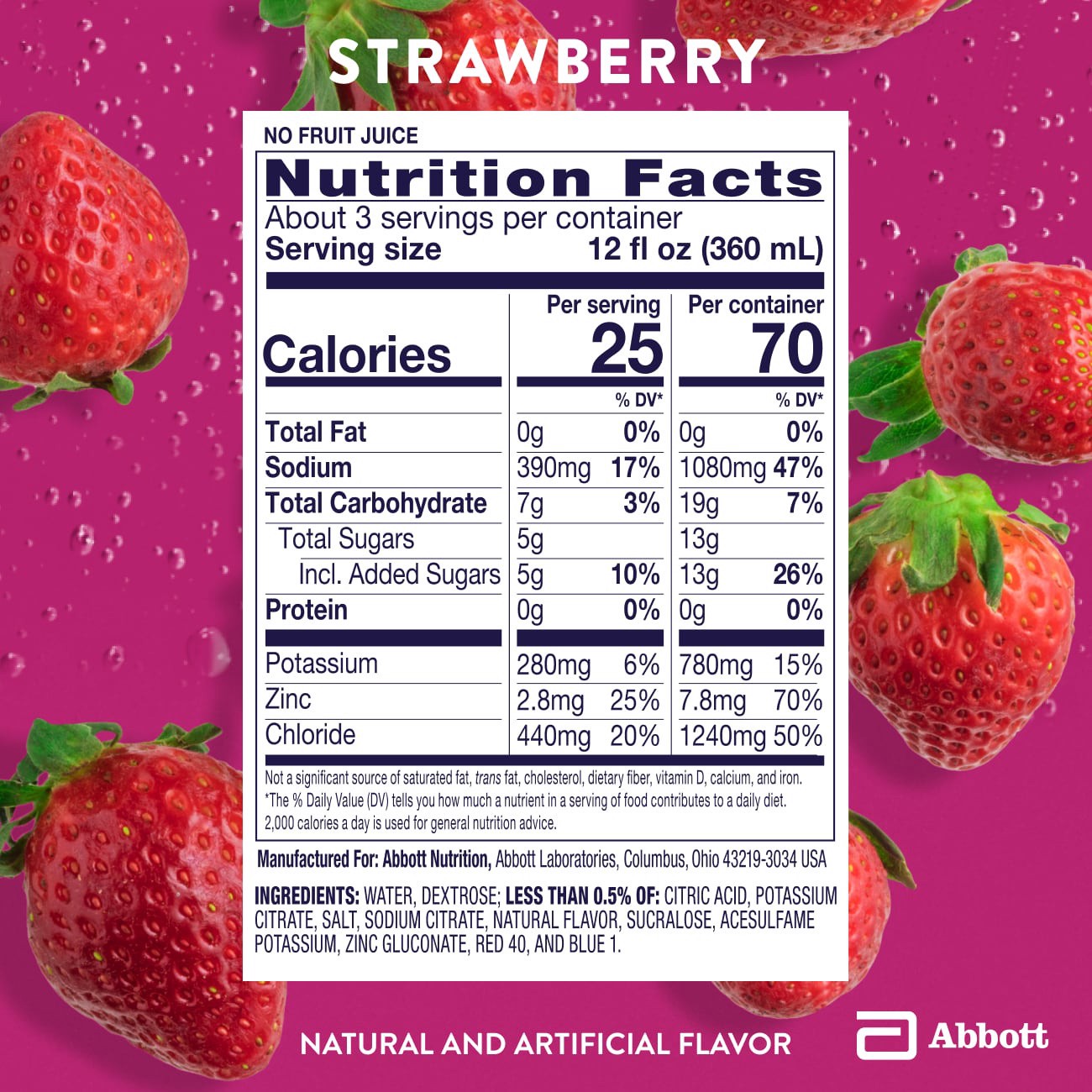 Water, Dextrose, Less than 2% of: Citric Acid, Potassium Citrate, Salt, Sodium Citrate, Natural Flavor, Sucralose, Acesulfame Potassium, Zinc Gluconate, Red 40, Blue 1