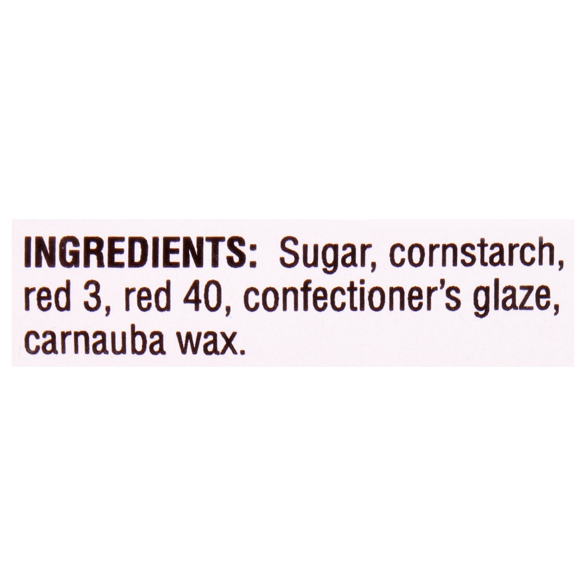 Sugar, Cornstarch, Red 3, Red 40, Confectioner's Glaze, Carnauba Wax.
