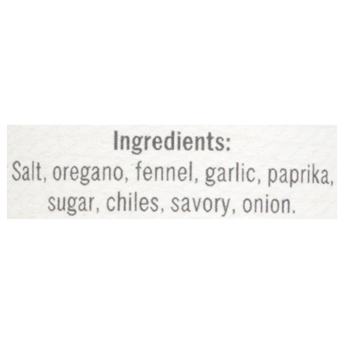 Salt, Oregano, Fennel, Garlic, Paprika, Sugar, Chiles, Savory, Onion.