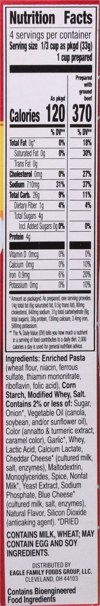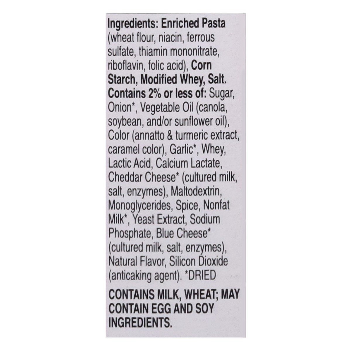 Enriched Pasta (Wheat Flour, Niacin, Ferrous Sulfate, Thiamin Mononitrate, Riboflavin, Folic Acid), Corn Starch, Modified Whey, Salt. Contains 2% or Less of: Sugar, Onion (Dried), Vegetable Oil (Canol…