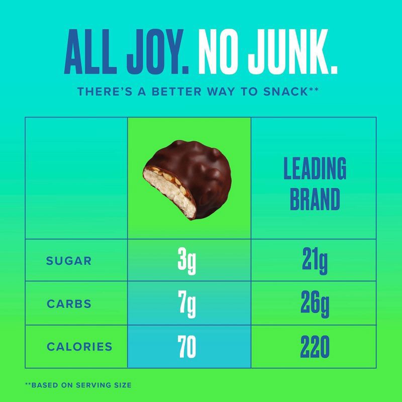 - SNACK WITH NO STRINGS ATTACHED: Your favorite coconut chocolate bar just got a better-for-you makeover. With only 3g of sugar—you'll taste the joy in every bite. indulge in a delicious portion-controlled chocolate coconut snack with only 80 calories and 3g of sugar per serving.