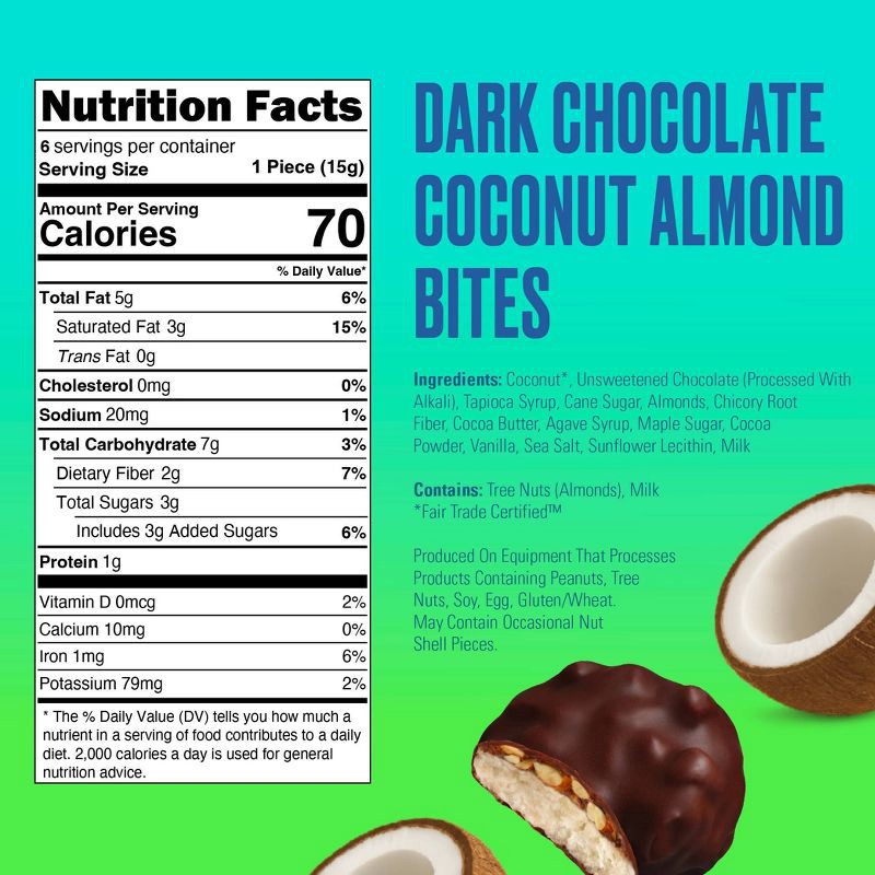 - ALL JOY. NO JUNK.: Our Dark Chocolate Coconut Bites are made by combining loads of coconut and crunchy almonds, all dipped in a thin dark chocolate shell.