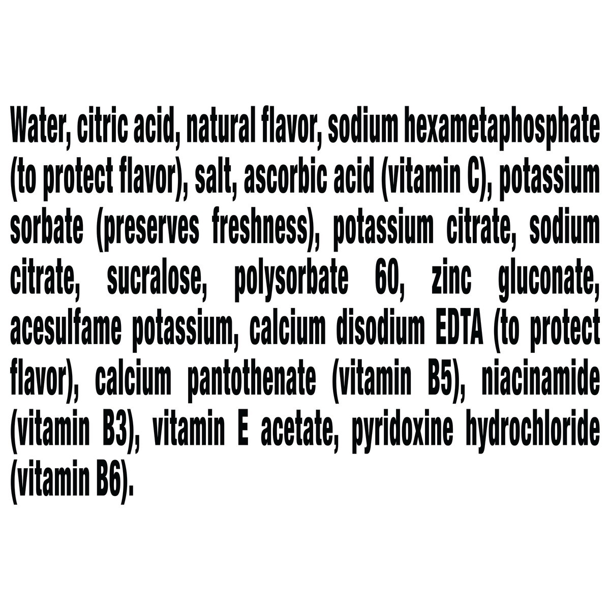 Water, Citric Acid, Natural Flavor, Sodium Hexametaphosphate (to Protect Flavor), Salt, Ascorbic Acid (Vitamin C), Potassium Sorbate (Preserves Freshness), Potassium Citrate, Sodium Citrate, Sucralose…