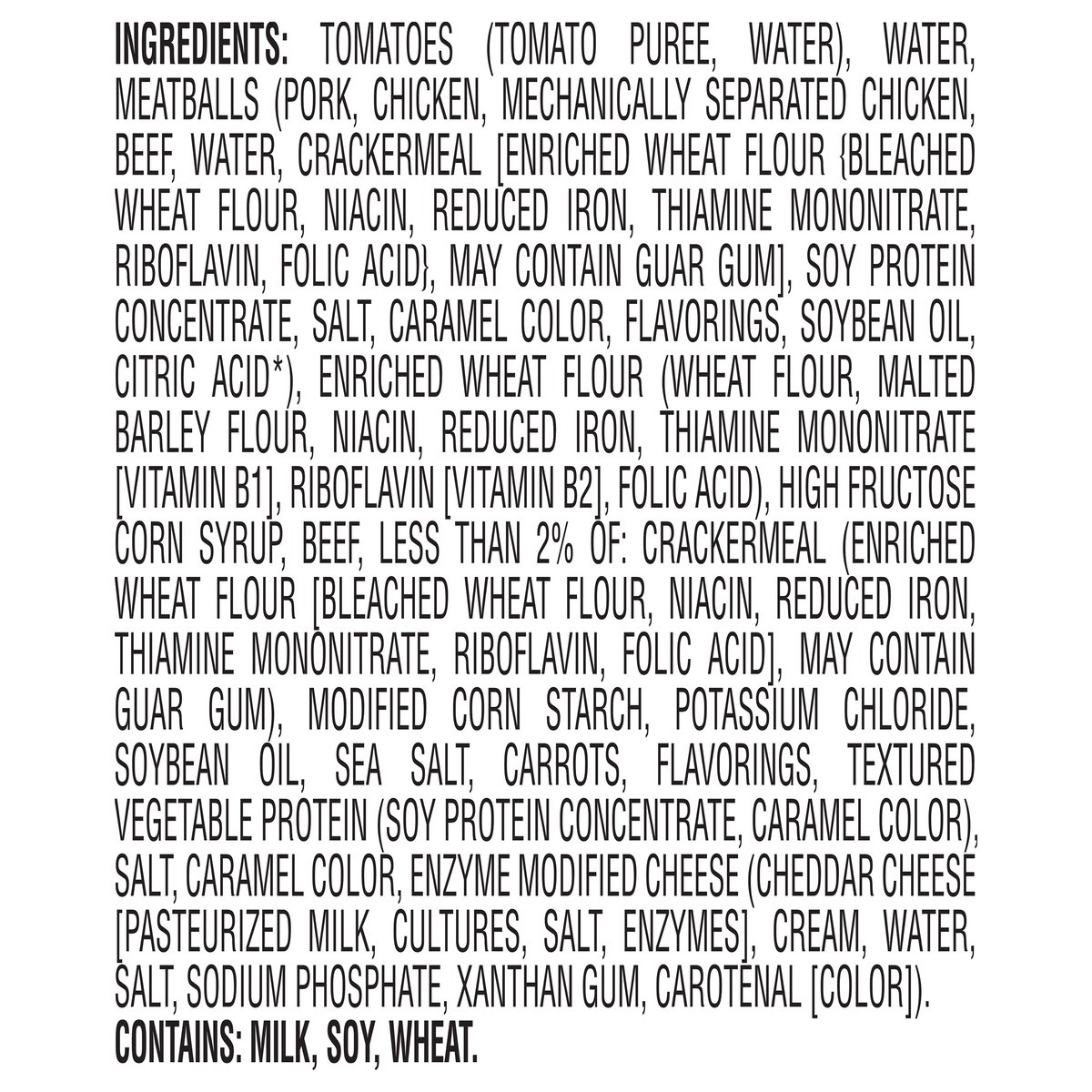 Tomatoes (Tomato Puree, Water), Water, Meatballs (Pork, Chicken, Mechanically Separated Chicken, Beef, Water, Crackermeal [Enriched Wheat Flour {Bleached Wheat Flour, Niacin, Reduced Iron, Thiamine Mo…
