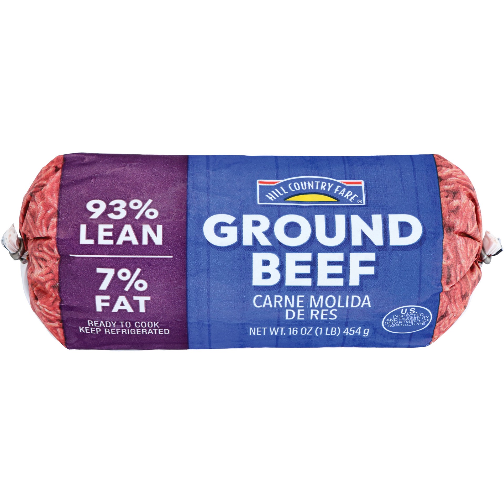 Hill Country Fare 93% lean/7% fat ratio ground beef is lean with no additives. A delicious and convenient protein choice to make your favorite meals.• Ground Beef• 93% lean, 7% fat• Great protein choi…