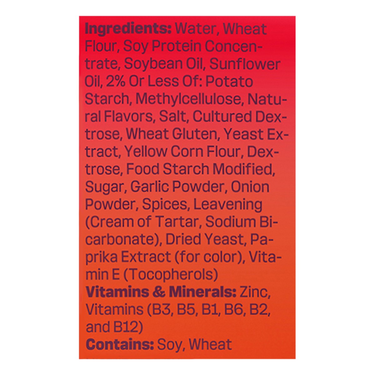 Water, Wheat Flour, Soy Protein Concentrate, Soybean Oil, Sunflower Oil, 2% or Less of: Potato Starch, Methylcellulose, Natural Flavors, Salt, Cultured Dextrose, Wheat, Gluten, Yeast Extract, Yellow C…