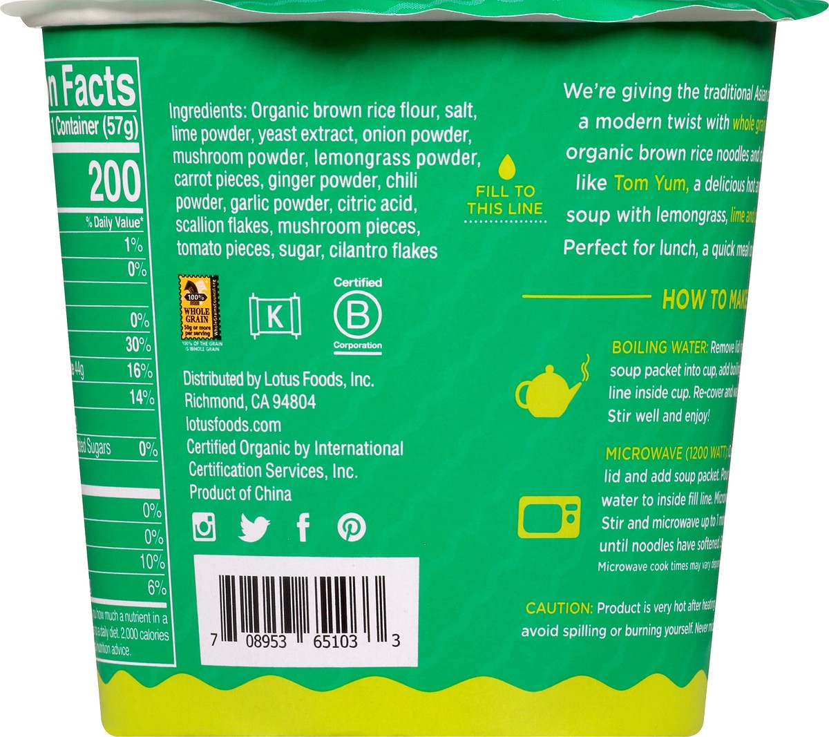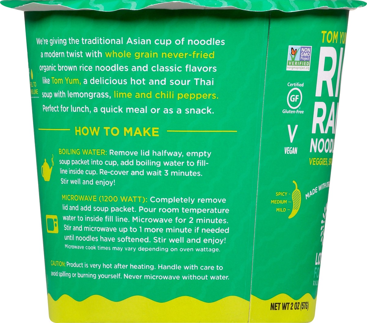 Veggie, spices & noodles. Certified gluten-free. Vegan. 100% Whole Grain: 50 g or more per serving. 100% of the grain is whole grain. WholeGrainsCouncil.org. Certified Organic by International Certifi…