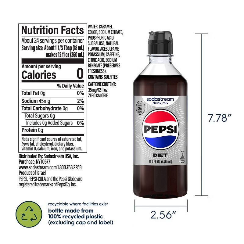- Includes: (1) Sodastream Diet Pepsi Soda Drink Mix - 14.9 fl ozIncludes: (1) Sodastream Diet Pepsi Soda Drink Mix - 14.9 fl oz