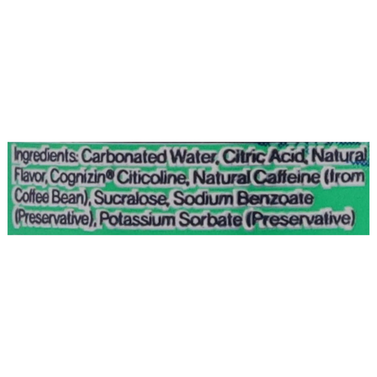 Carbonated Water, Citric Acid, Natural Flavor, Cognizin Citicoline, Natural Caffeine (from Coffee Bean), Sucralose, Sodium Benzoate (Preservative), Potassium Sorbate (Preservative).