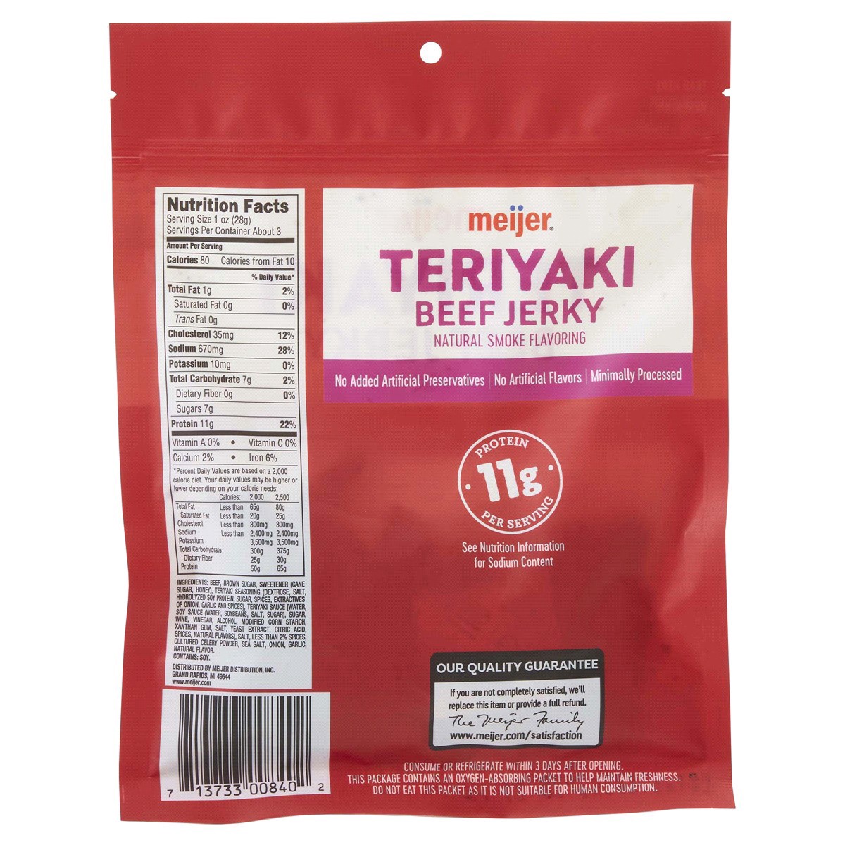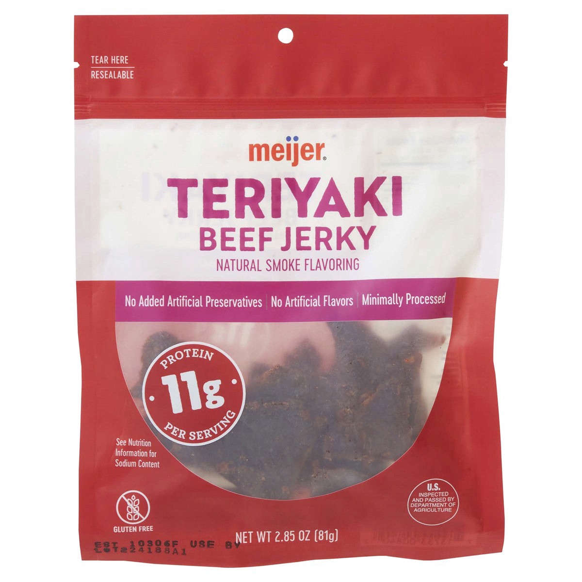 Enjoy classic Asian-inspired flavors and a satisfying chewy texture with every protein-packed bite of Meijer Teriyaki Beef Jerky. Take them with you on the road, sneak them in your office desk, or sna…