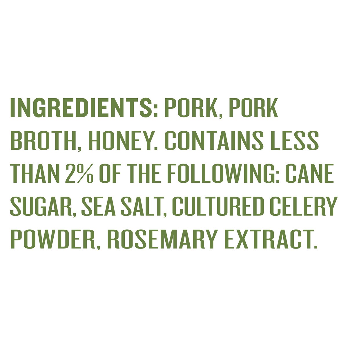 Pork, Water, Honey, Cane Sugar. Contains Less Than 2% Of The Following: Sea Salt, Celery Powder.