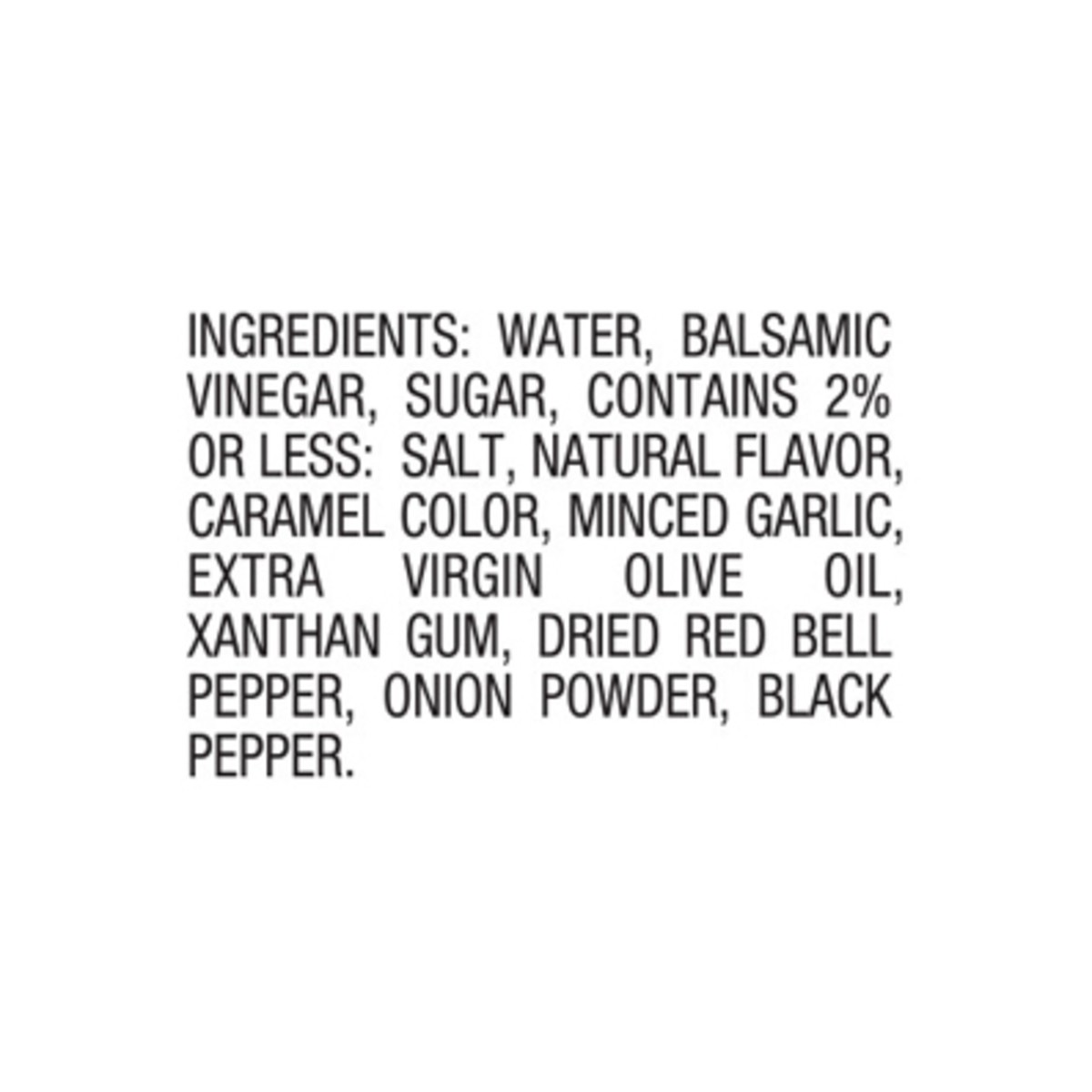 Water, Balsamic Vinegar, Sugar, Contains 2% Or Less: Salt, Natural Flavor, Caramel Color, Minced Garlic, Extra Virgin Olive Oil, Xanthan Gum, Dried Red Bell Pepper, Onion Powder, Black Pepper.