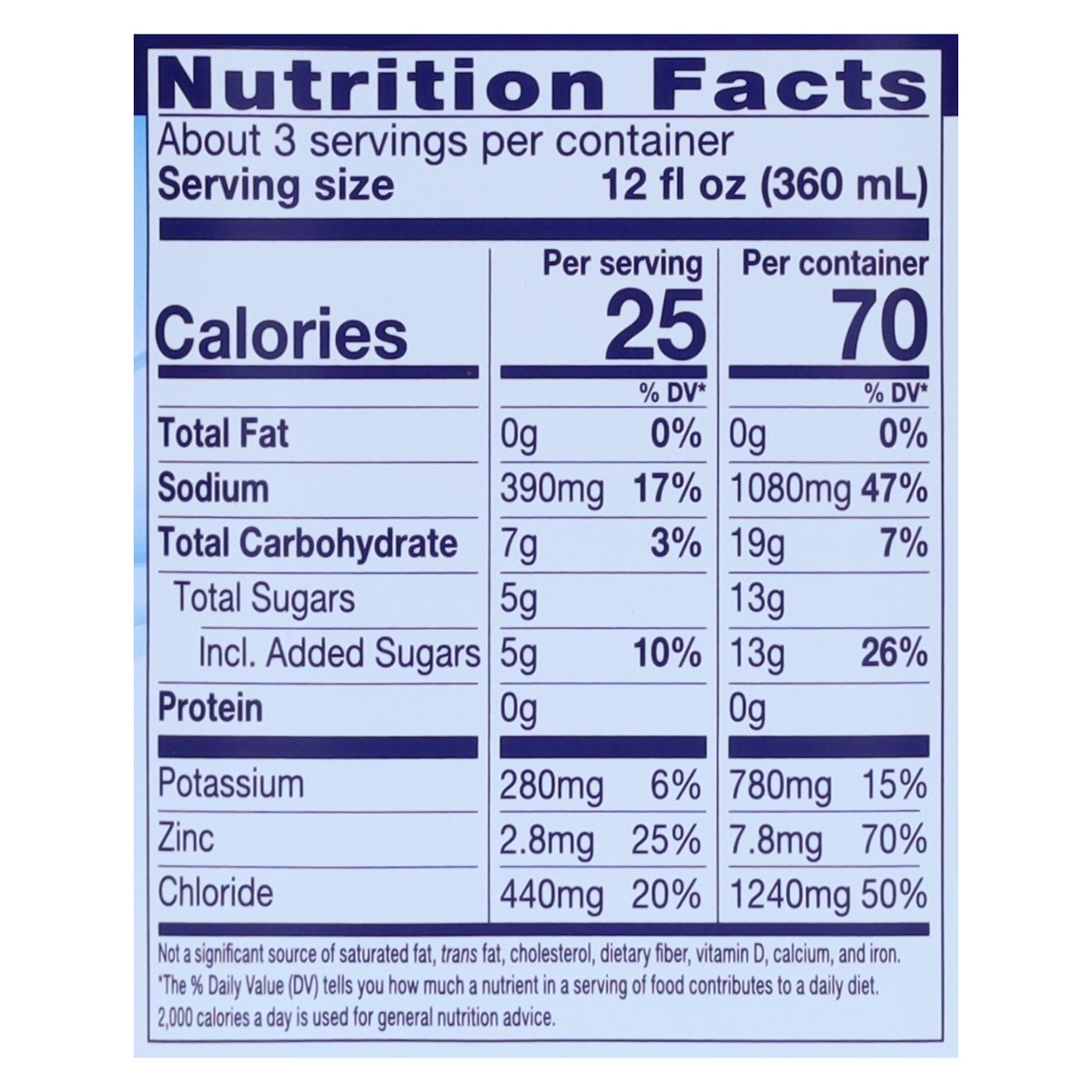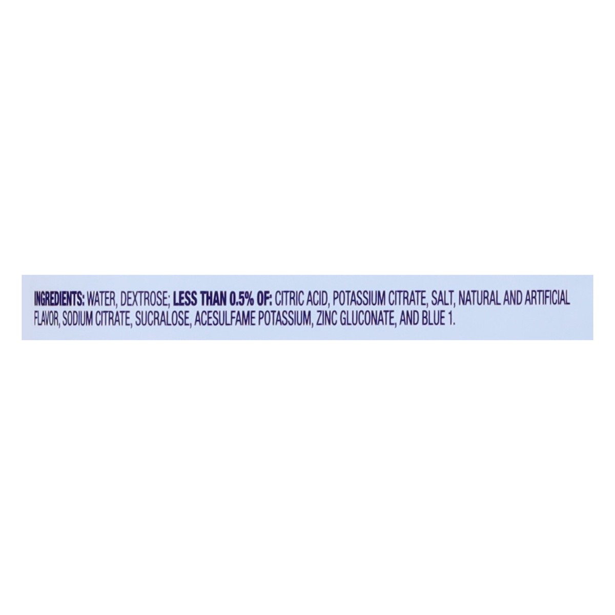 Water, Dextrose; Less than 0.5% of: Citric Acid, Potassium Citrate, Salt, Natural and Artificial Flavor, Sodium Citrate, Sucralose, Acesulfame Potassium, Zinc Gluconate, and Blue 1.