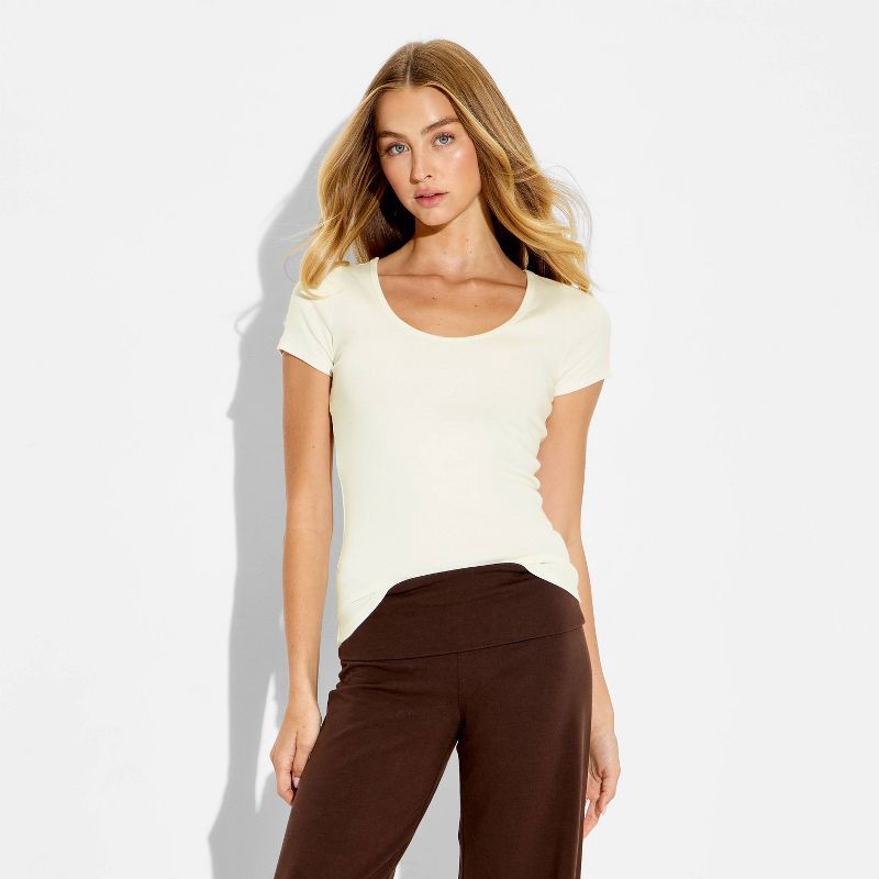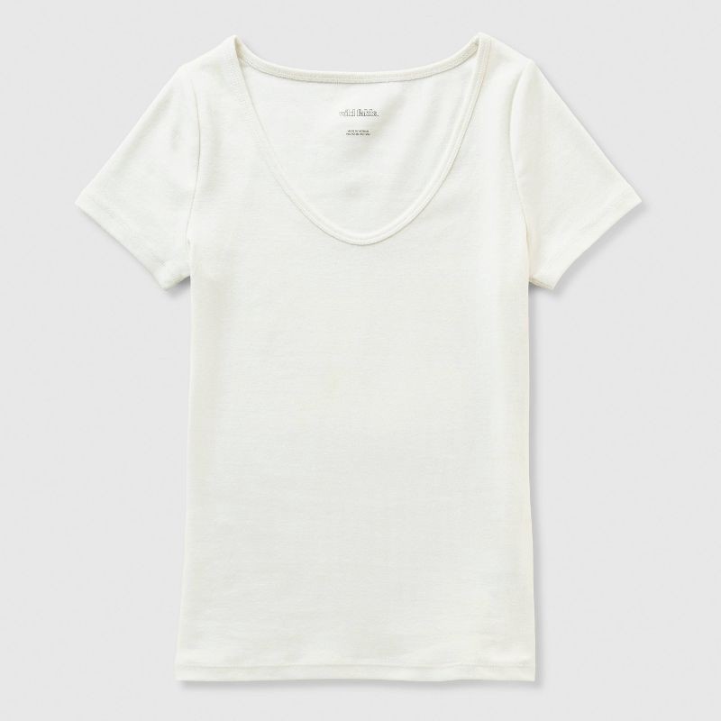 Long & lean T-shirt from Wild Fable™ in a solid shade. Designed with a scoop neckline and short sleeves. Crafted from midweight cotton 1 1 rib fabric with spandex for comfortable wear that moves and s…