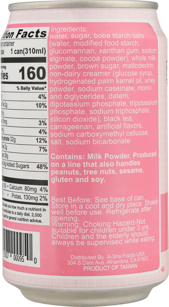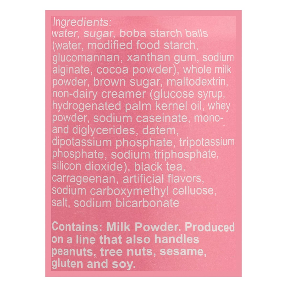 Water, Sugar, Boba Starch Balls (Water, Modified Food Starch, Glucomannan, Xanthan Gum, Sodium Alginate, Cocoa Powder), Whole Milk Powder, Brown Sugar, Maltodextrin, Non-Dairy Creamer (Glucose Syrup, …