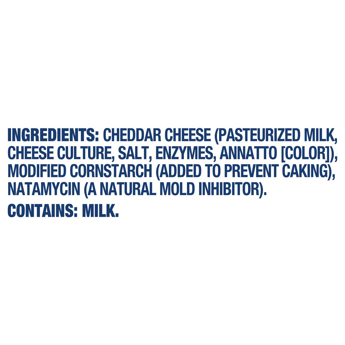 Cheddar Cheese (Pasteurized Milk, Cheese Culture, Salt, Enzymes, Annatto [Color]), Modified Cornstarch (Added to Prevent Caking), Natamycin (a Natural Mold Inhibitor).