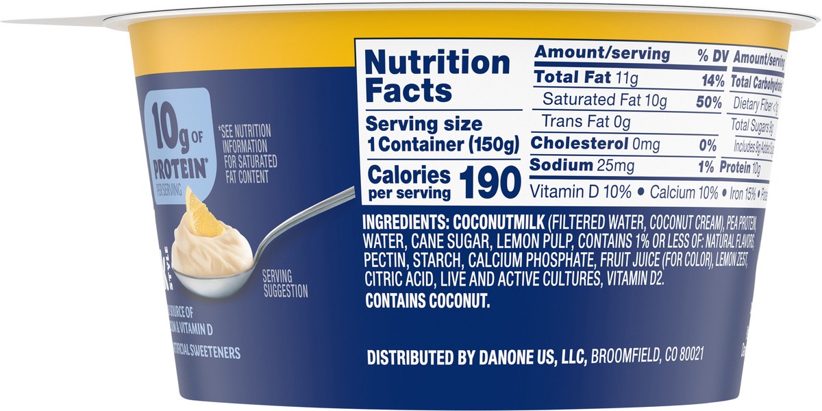 Coconutmilk (Filtered Water, Coconut Cream), Pea Protein, Water, Cane Sugar, Lemon Pulp, Contains 1% or Less of: Natural Flavors, Pectin, Starch, Calcium Phosphate, Fruit Juice (for Color), Lemon Zest…