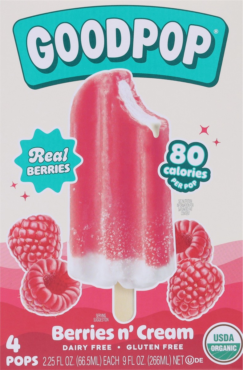 GoodPop Berries n' Cream organic fruit pops taste like a spoonful of fresh summer berries dipped in silky cream. Made with tangy-sweet organic raspberry juice and filled with smooth coconut cream, eve…