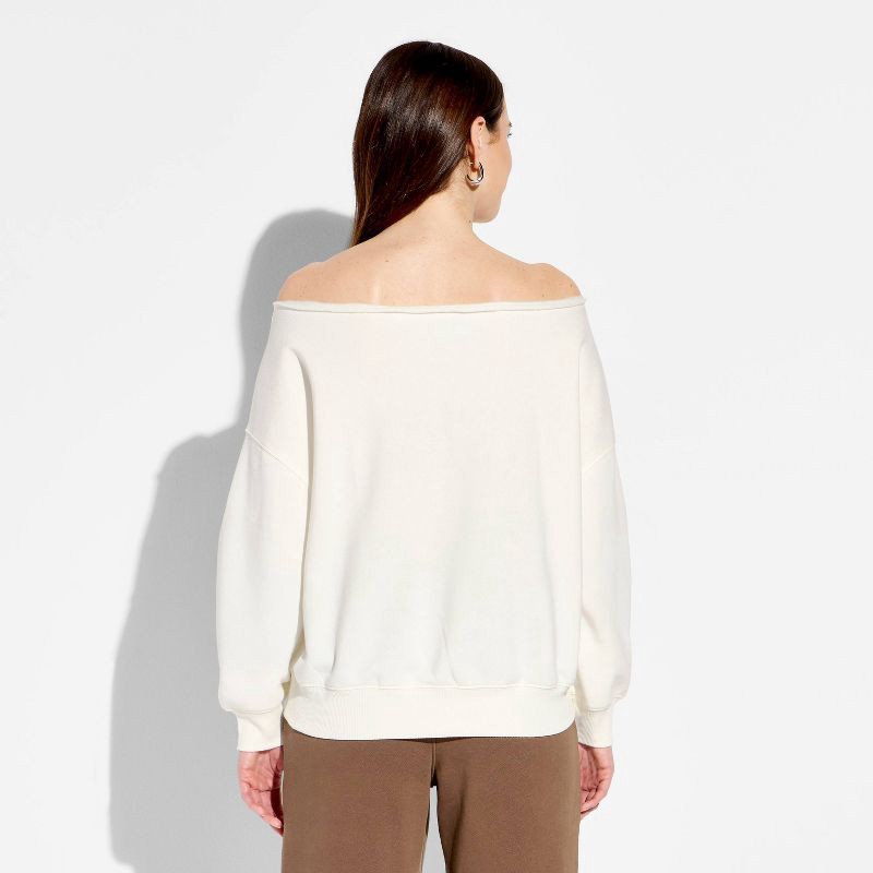 - Off-the-shoulder neckline and drop-shoulder long sleeves