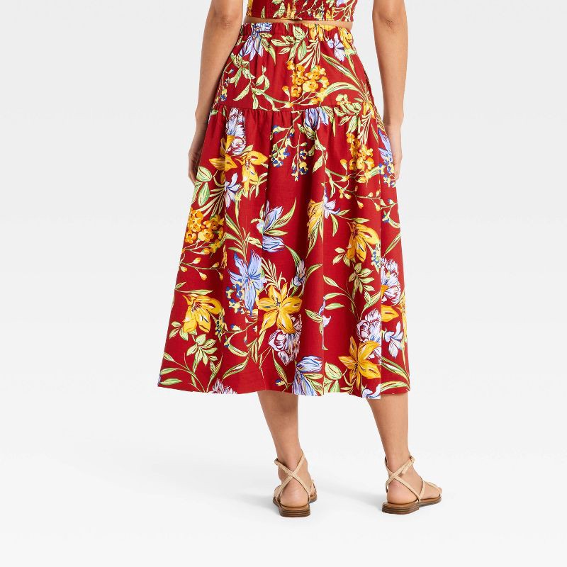 Women's Resort Poplin Drop Waist Midi Skirt - A New Day™ Dark Red Floral XS