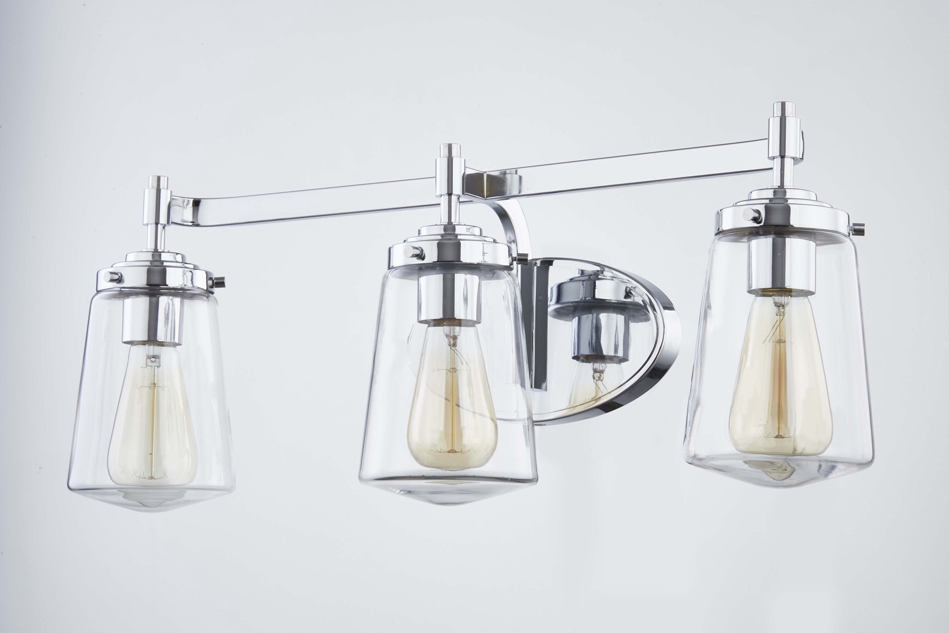 Modern farmhouse 3 Lt vanity. Polished chrome finish. Clear blown glass. Wall mount.