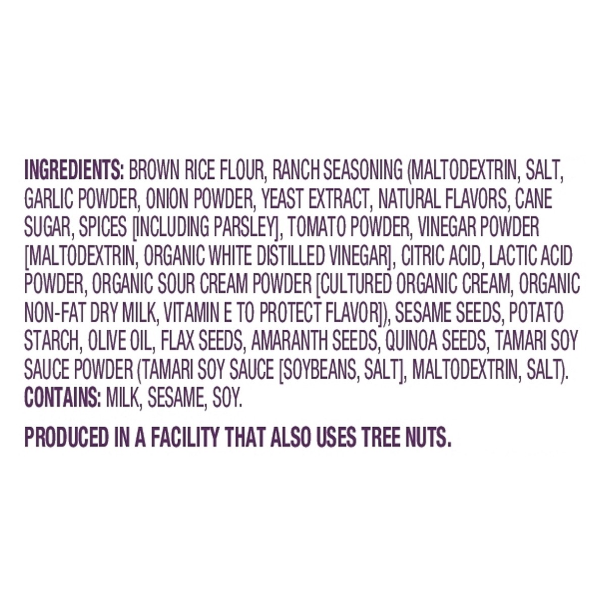 Brown Rice Flour, Ranch Seasoning (Maltodextrin, Salt, Garlic Powder, Onion Powder, Yeast Extract, Natural Flavors, Cane Sugar, Spices [Including Parsley], Tomato Powder, Vinegar Powder [Maltodextrin,…