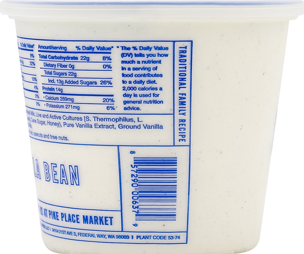 Yogurt (Grade A Pasteurized Milk, Live and Active Cultures [S. Thermphilus, L. Bulgaricus, L. Acidophilus, Bifidus, L. Casei], Cane Sugar, Honey), Pure Vanilla Extract, Ground Vanilla Beans.