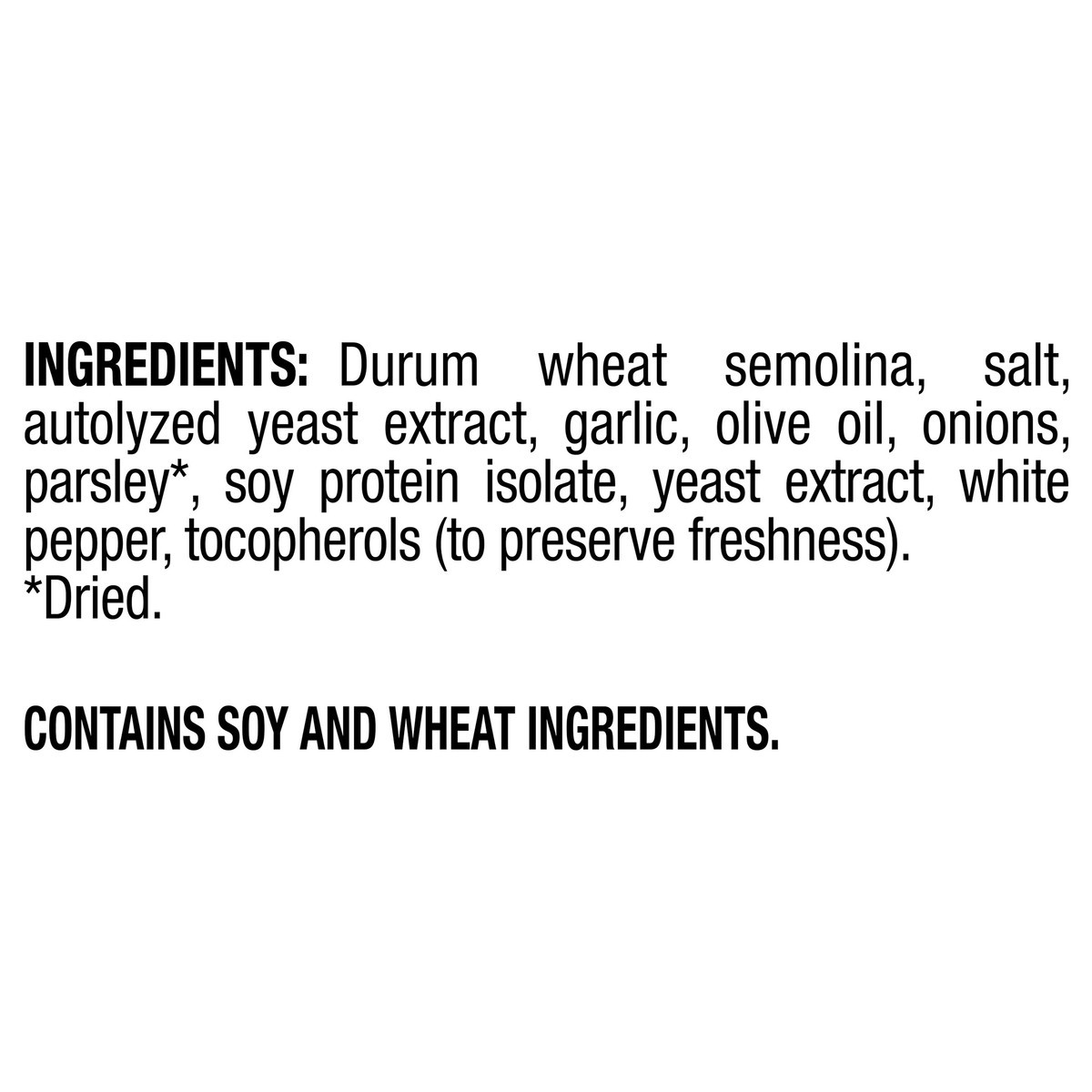 Durum Wheat Semolina, Salt, Autolyzed Yeast Extract, Garlic, Olive Oil, Onions, Parsley (Dried), Soy Protein Isolate, Yeast Extract, White Pepper, Tocopherols (to Preserve Freshness).