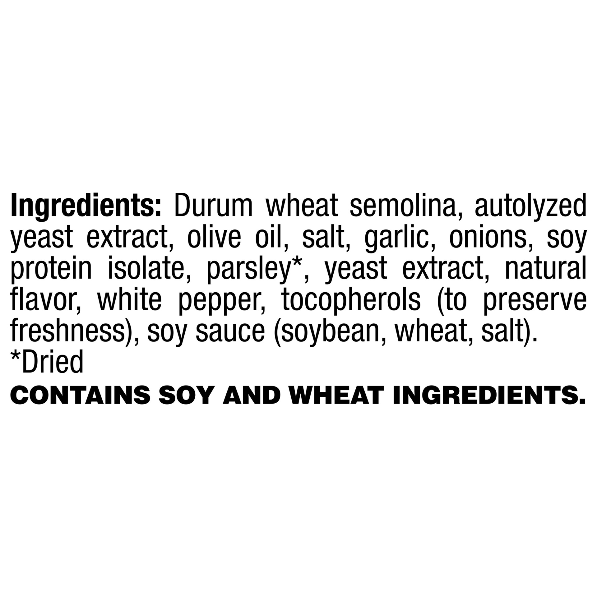 Durum Wheat Semolina, Salt, Autolyzed Yeast Extract, Garlic, Olive Oil, Onions, Parsley*, Soy Protein Isolate, Yeast Extract, White Pepper, Tocopherols (to Preserve Freshness). * Dried.