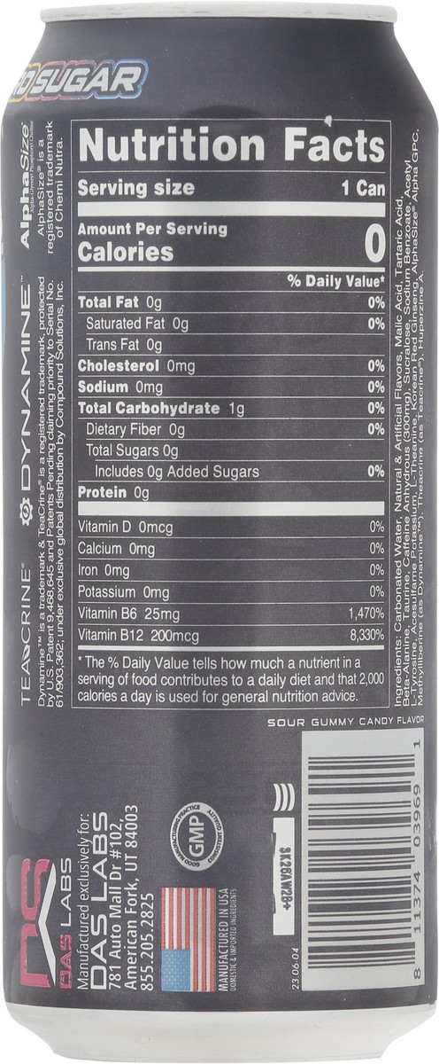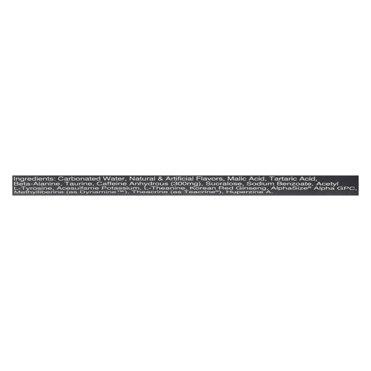Carbonated Water, Natural & Artificial Flavors, Malic Acid, Tartaric Acid, Beta-Alanine, Taurine, Caffeine Anhydrous (300mg), Sucralose, Sodium Benzoate, Acetyl L-Tyrosine, Acesulfame Potassium, L-Theā¦