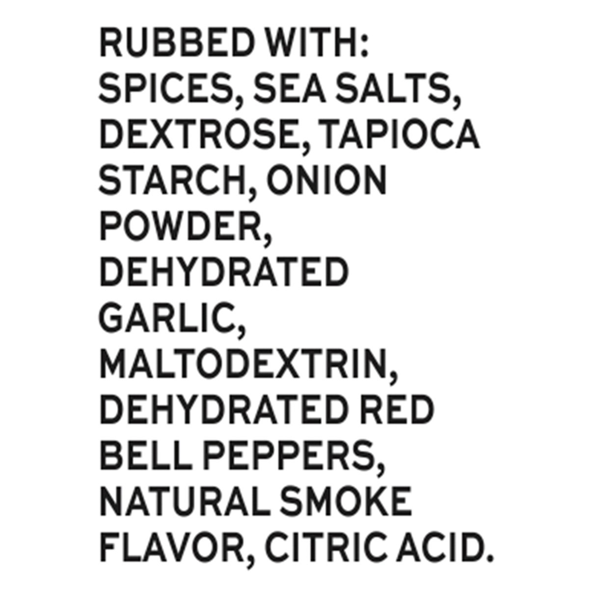 Rubbed with: Spices, Sea Salts, Dextrose, Tapioca Starch, Onion Powder, Dehydrated Garlic, Maltodextrin, Dehydrated Red Bell Peppers, Natural Smoke Flavor, Citric Acid.