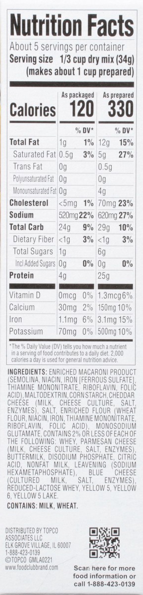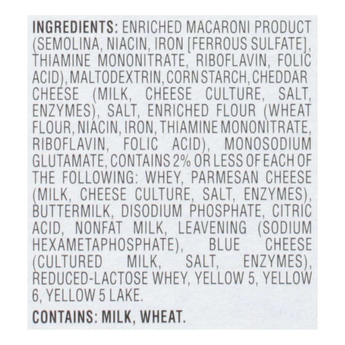 Enriched Macaroni Product (Semolina, Niacin, Iron [Ferrous Sulfate], Thiamine Mononitrate, Riboflavin, Folic Acid), Maltodextrin, Corn Starch, Cheddar Cheese (Milk, Cheese Culture, Salt, Enzymes), Sal…