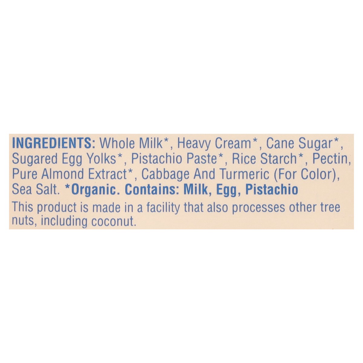 Whole Milk (Organic), Heavy Cream (Organic), Cane Sugar (Organic), Sugared Egg Yolks (Organic), Pistachio Paste (Organic), Rice Starch (Organic), Pectin, Pure Almond Extract (Organic), Cabbage and Tur…