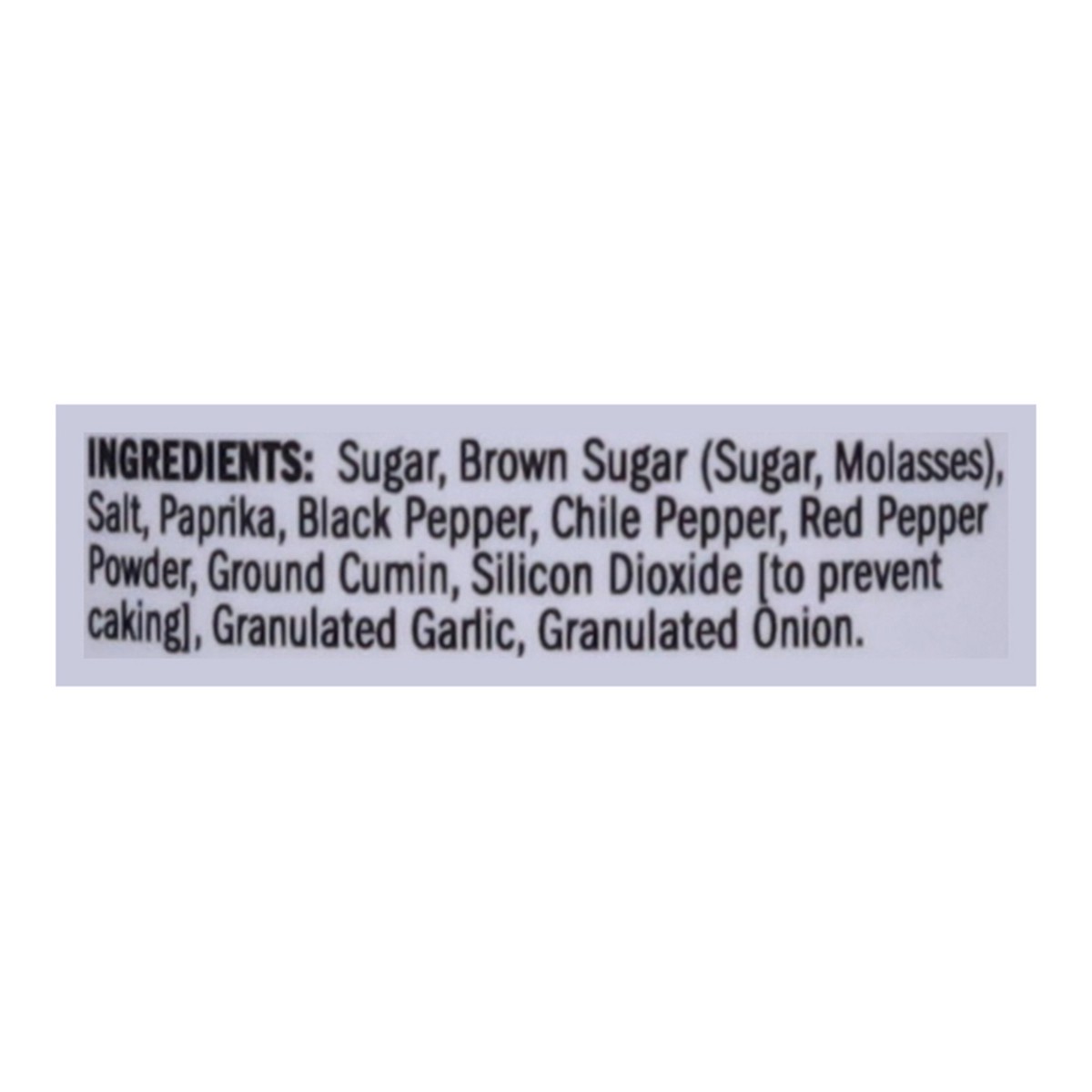 Sugar, Brown Sugar (Sugar, Molasses), Salt, Paprika, Black Pepper, Chile Pepper, Red Pepper Powder, Ground Cumin, Silicon Dioxide [to Prevent Caking], Granulated Garlic, Granulated Onion.