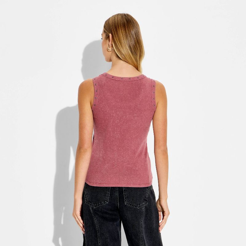 - Reinforced ribbed trimming and studded detailing on scoop neckline and armholes
