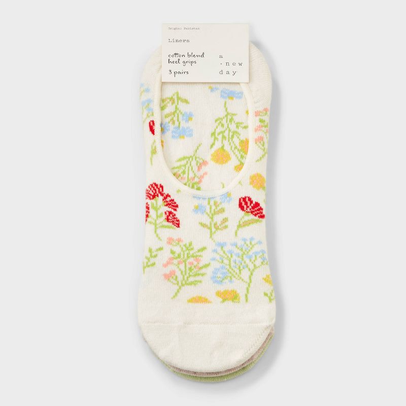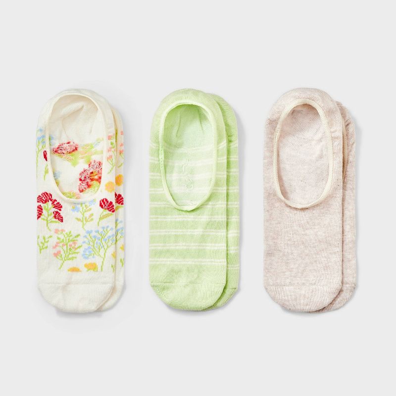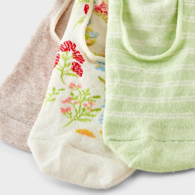 Revamp your wardrobe essentials with these Heart & Flowers Liner Socks from A New Day™. This pack includes three pairs of liner socks — one pair in beige, one in green with white stripes, and one in w…