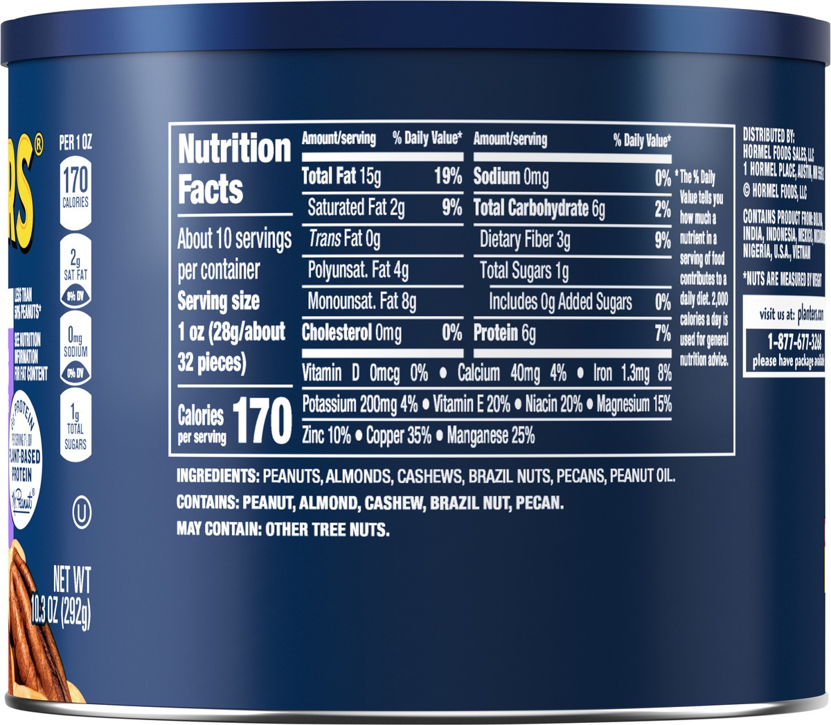 Ingredients: Peanuts, Almonds, Cashews, Brazil Nuts, Pecans, Peanut Oil. Contains: Peanut, Almond, Cashew, Brazil Nut, Pecan. May Contain: Other Tree Nuts.