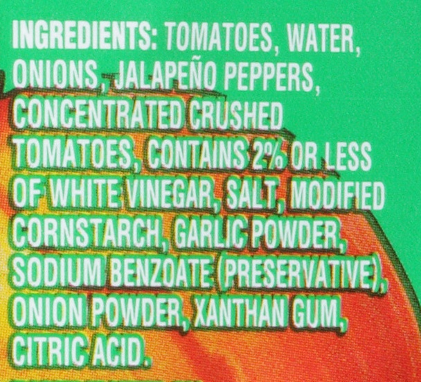 Ingredients: Tomatoes in Tomato Juice (Contains Citric Acid [To Acidify], Calcium Chloride [Firming]), Water, Onions, Jalapeño Peppers, Concentrated Crushed Tomatoes, Contain 2% or less of White Vineg…