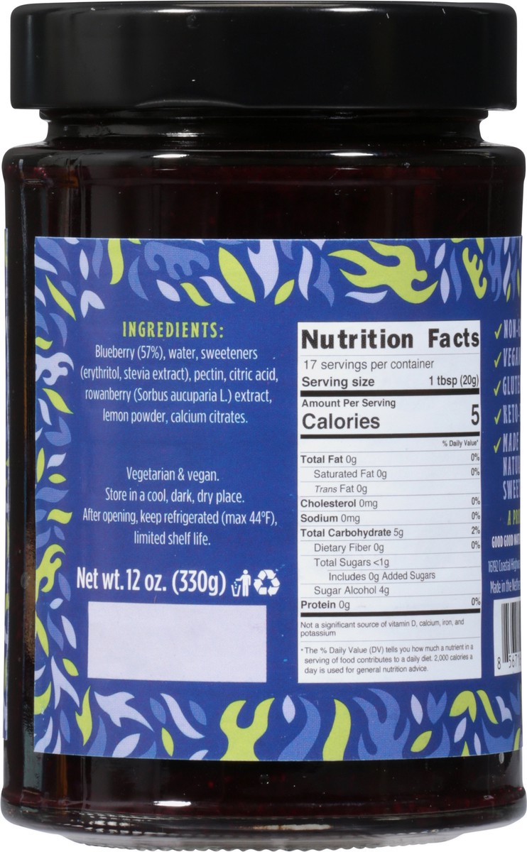 Blueberry (57%), Water, Sweeteners (Erythritol, Stevia Extract), Pectin, Citric Acid, Rowanberry (Sorbus Aucuparia L.) Extract, Lemon Powder, Calcium Citrates.
