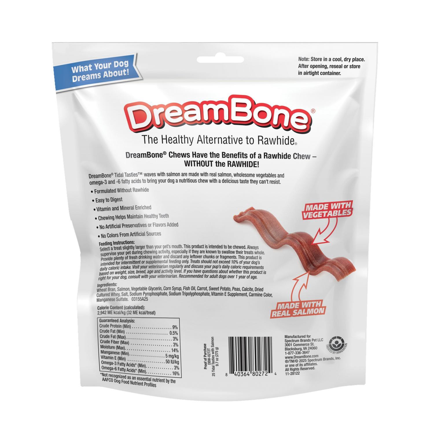 DreamBone Tidal Tasties waves with salmon are made with real salmon, wholesome vegetables and omega-3 and 6 fatty acids to bring your dog a nutritious chew with a delicious taste they can't resist.