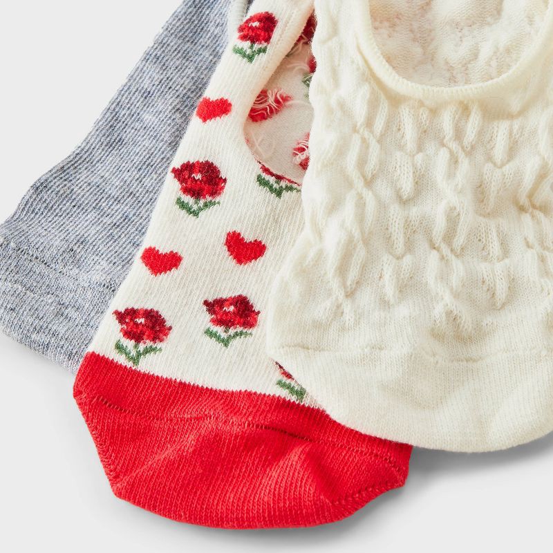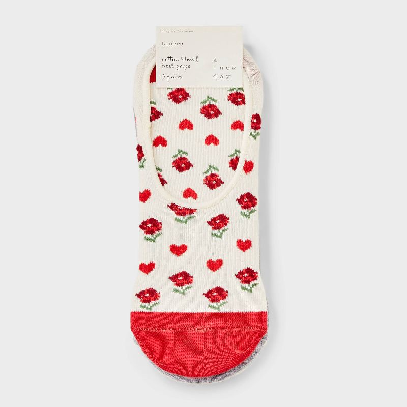 Revamp your wardrobe essentials with these Heart & Flowers Liner Socks from A New Day™. This pack includes three pairs of liner socks — one in a cream color, one in gray, and one in red and white with…
