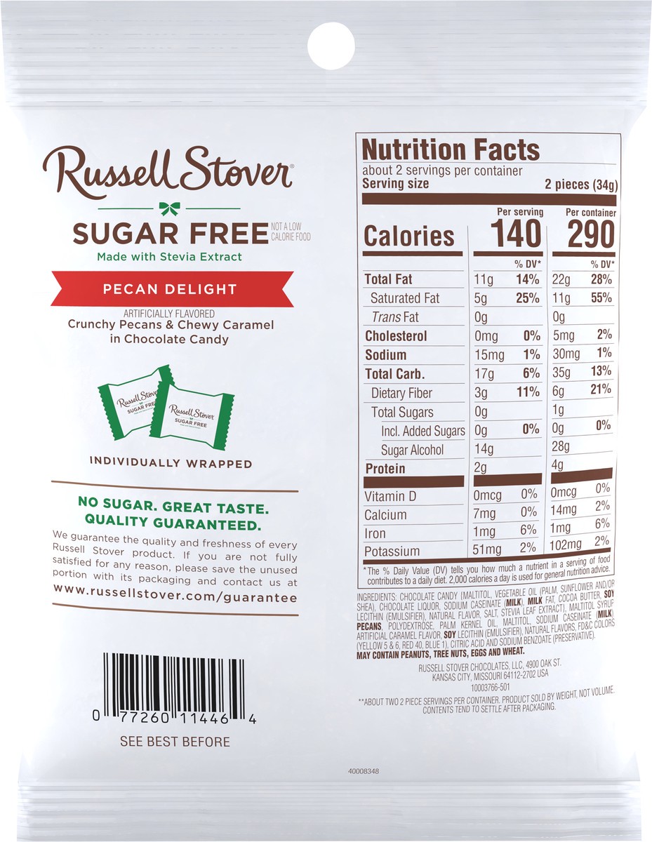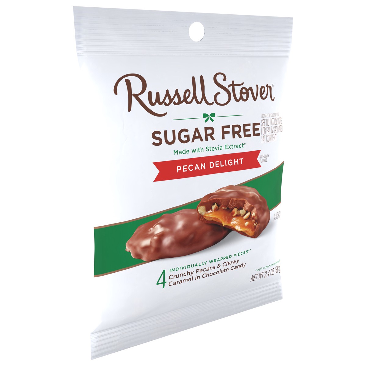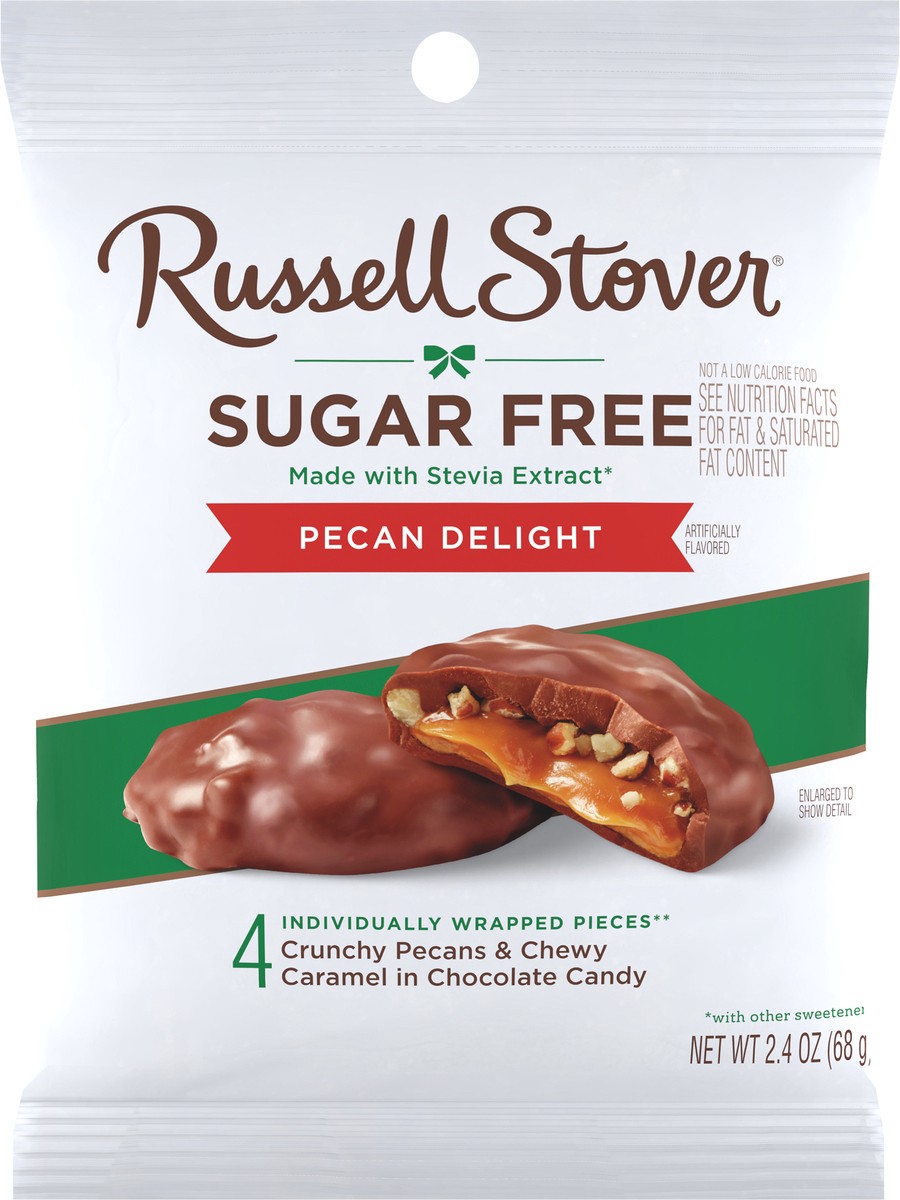 - RUSSELL STOVER Sugar Free Pecan Delights in Chocolate Candy are made with Stevia extract, a plant-based sweetener that delivers all the sweet taste you crave with no added sugar - zero sugar, great taste!
