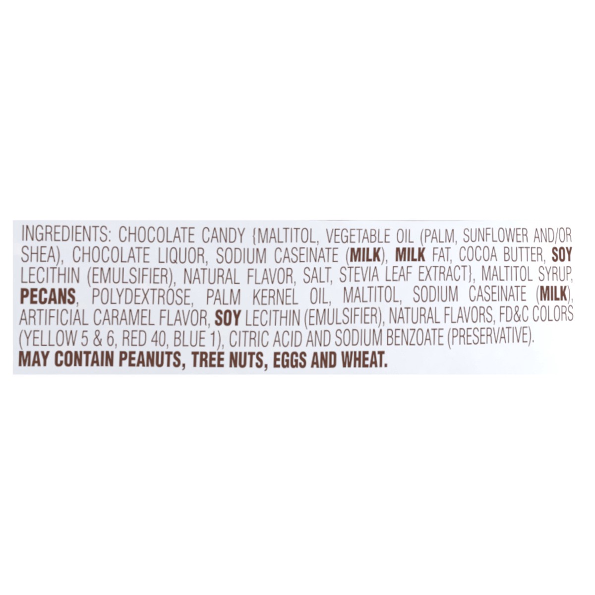 Chocolate Candy (Maltitol\, Vegetable Oil (Palm\, Sunflower and/or Shea)\, Chocolate Liquor\, Sodium Caseinate (Milk)\, Milk Fat\, Cocoa Butter\, Soy Lecithin (Emulsifier)\, Natural Flavor\, Salt\, St…